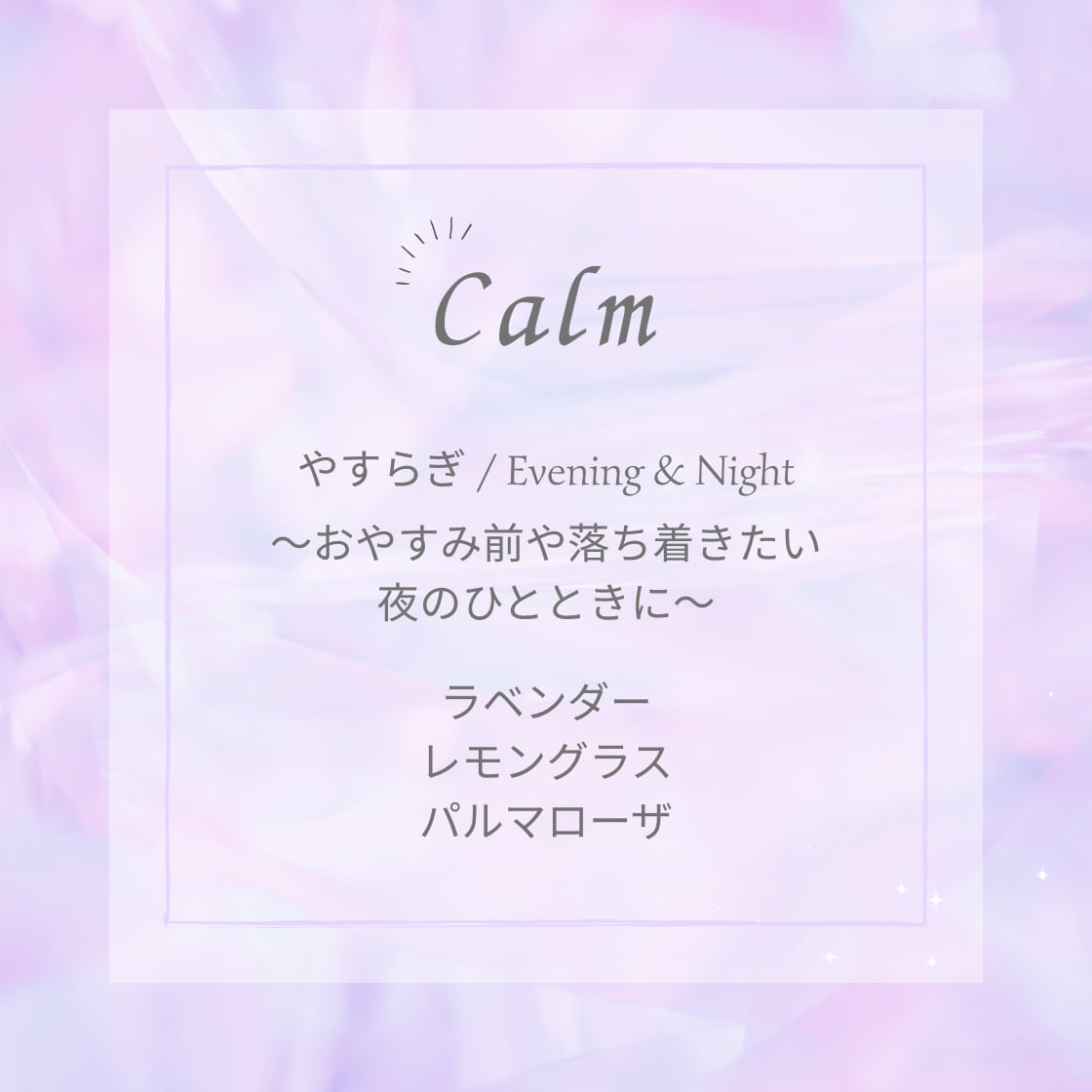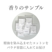 香りを染み込ませたコットンをパウチ容器に封入していますので、実際に香ってご確認いただけます。精油は濃度が濃いため、Charm(希釈済み)を除き、直接肌に触れないようご注意ください。